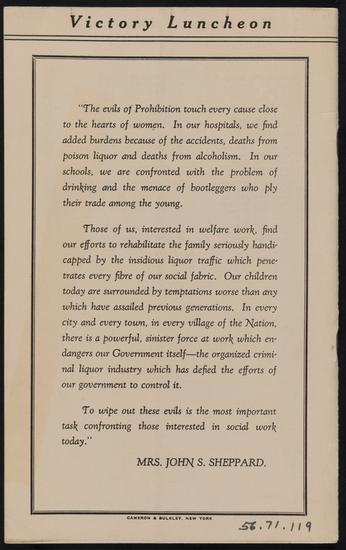 New York State Division. Women's Organization for National Prohibition Reform. Victory Luncheon