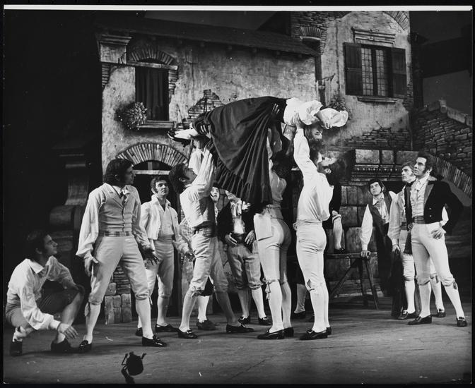 [Ornella Vanoni as Rosetta and Nino Manfredi in the title role of "Rugantino".]