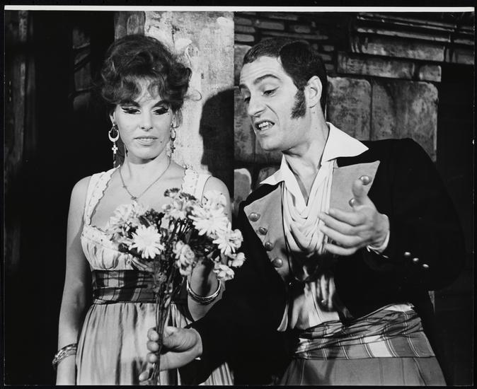[Aldo Fabrizi as Mastro Titta and Ornella Vanoni as Rosetta in "Rugantino".]