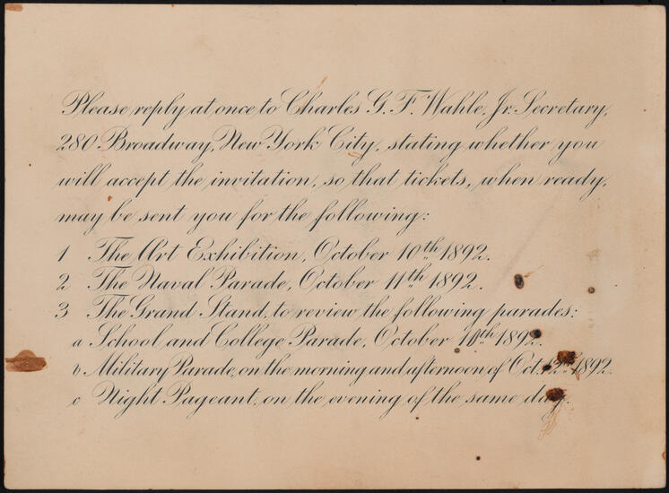 The City of New York requests the honor of your presence at its Celebration of the Four Hundredth Anniversary of the Discovery of America