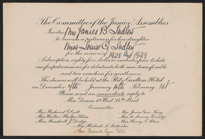 [The Committee of the Junior Assemblies invites Miss Louise G. Ludlow to become a member for the season of 1929 and 1930.]