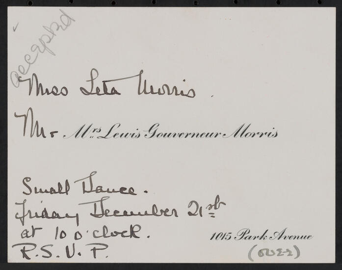 [Mr. and Mrs. Samuel Riker request the pleasure of Miss Ludlow's company at a dance in honour of their daughter Miss Lavinia Riker.]