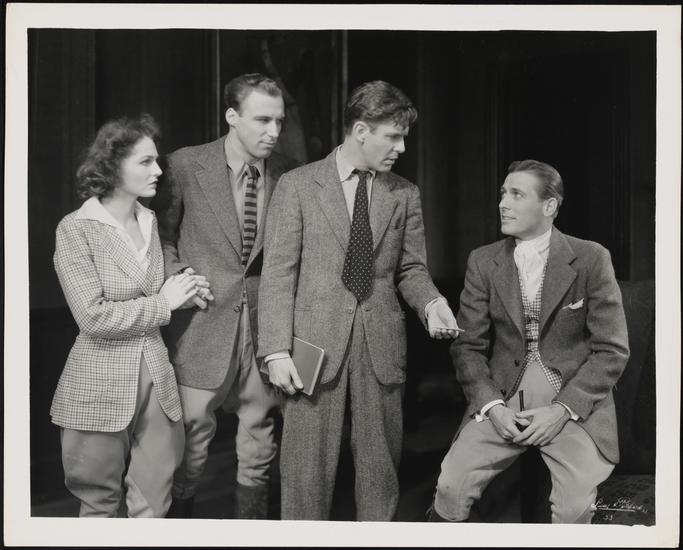 [Peter Fernandez as Wakefield, Robert Shayne as Renny, and Alan Hale as Piers in "Whiteoaks".]