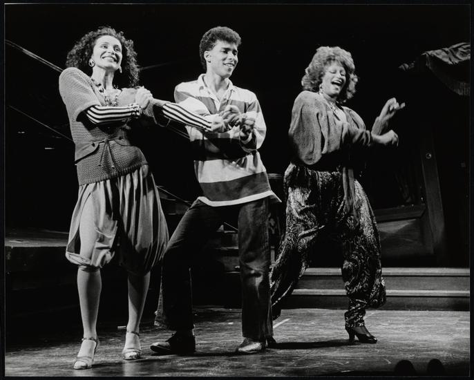 [Michele Mais as Madame Bouaffa, Alex Paez as Momo and Yamil Borges as Jasmine in "Roza".]