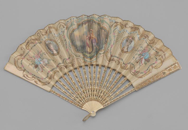 Folding fan of net and cream silk leaf with painted vignette