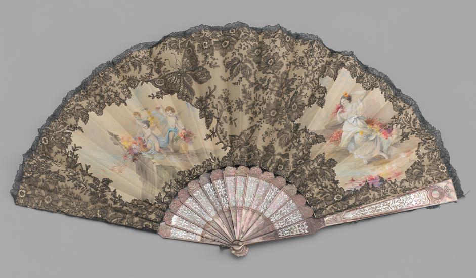 Folding fan of cream lace and painted gauze leaf