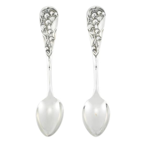 One of a pair of coffee spoons with egg-shape bowl and rounded up-turned handle decorated with the "Lily of Valley" pattern. Inscription: On handle reverse: '69 H '93 Mark: On handle reverse: STERLING/MAUSER MFG CO./[device]