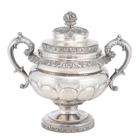 Sugar bowl part of a three-piece tea service with raised round melon-reeded body with diamonds at top of reeds, die-rolled floral-and-leaf borders in three sizes applied at lip, shoulder, juncture of the body and pedestal, and edge of stepped circular pedestal, loose cover of sugar bowl ornamented with repoussé-chased leaves and buds and basket-of-flowers finial, and two cast S-scroll handles. Inscription: Engraved on body: J.M.B Jr. / from his / Grandmother / E.B. Engraved in upper and lower-case italics on underside of foot: Mary Bradhurst 1840 Augusta Currie Field 1880 Mary Pearsall Field 1919 / William Bradhurst Osgood Field Jr. 1929. Mark: Struck twice on underside of sugar bowl in script within conforming enclosure: W Thomson.