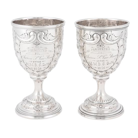 One of a pair of goblets with spun, tulip-shape body with everted lip, applied beaded border on stepped circular foot, body and foot repoussé-chased with scroll and foliate ornament, and scrolls on body create reserves for inscription. The pair to this goblet is 70.103.2. Inscription: Engraved within reserve: "Presented to Aaron S. Van Praag/By The/H.M.B.S. Oct. 26/1856". Unmarked.