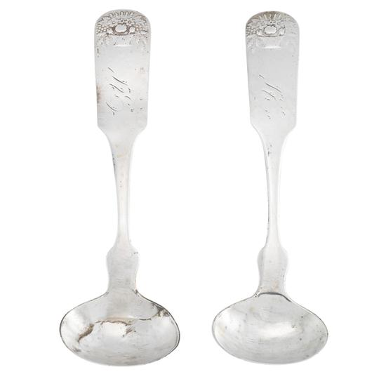 One of a pair of salt spoons with oval-shaped bowl and downturned fiddlehandle decorated with molded motif of a basket of flowers. Maker possibly John C. Moore (approximately 1802-1874) or Jared L. Moore (active 1826-1839). Inscription: Engraved on handle obverse: Y. Mark: Marked on handle reverse: MOORE.