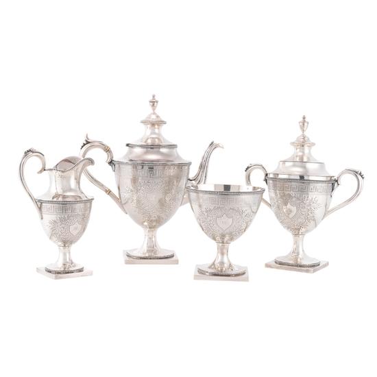 Helmet-shaped creamer from tea service, spreading circular foot on square plinth, beading at lip, shoulder and feet, engraved with Greek key border and floral wreaths around shields on body, and lip outlined with beading and cast S-scroll handle with furl and drops. Inscription: Engraved within one shield on body with script initials: CM. Mark: Struck on underside: A. RUMRILL & CO. / [pseudohallmark] C & D [pseudohallmark] / 981.
