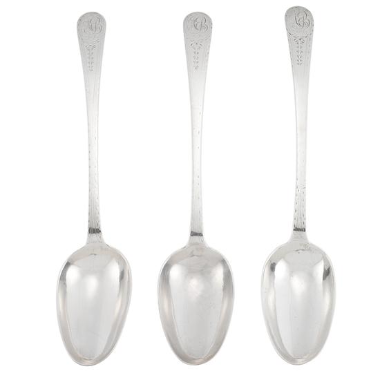 One of a set of three tablespoons with slightly out-curved end and decorated with bright-cut motif. Inscription: Engraved on handle obverse : A. E. B. Engraved on handle reverse: Abraham Bussing / 1749 / Elizabeth Mesier. | Mark: Marked on handle reverse: T.U. / I.V.
