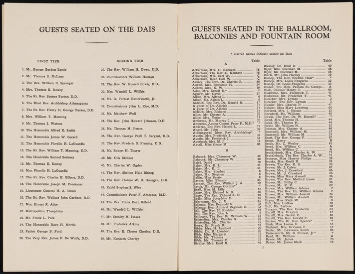 Seating List. The Citizens Dinner to Honor the Rt. Rev. William T. Manning, D.D. and the New York Protesant Espiscopal City Mission Society