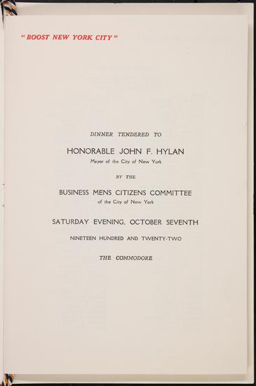 "Boost New York City". Dinner tendered to Honorable John F. Hylan, Mayor of New York City