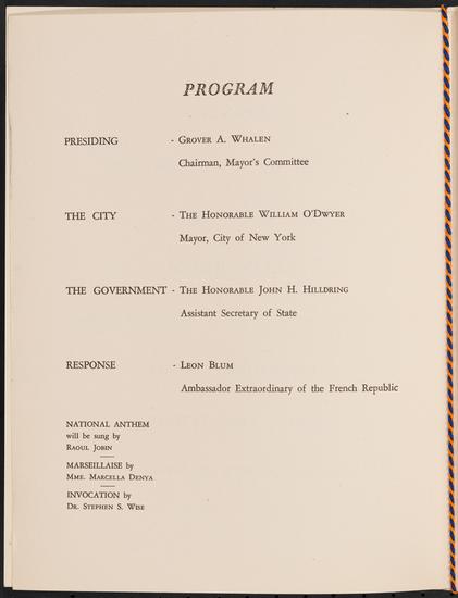 Dinner Given by the City of New York in Honor of His Excellency Leon Blum Ambasadeur Extraordinaire United States of the French Republic