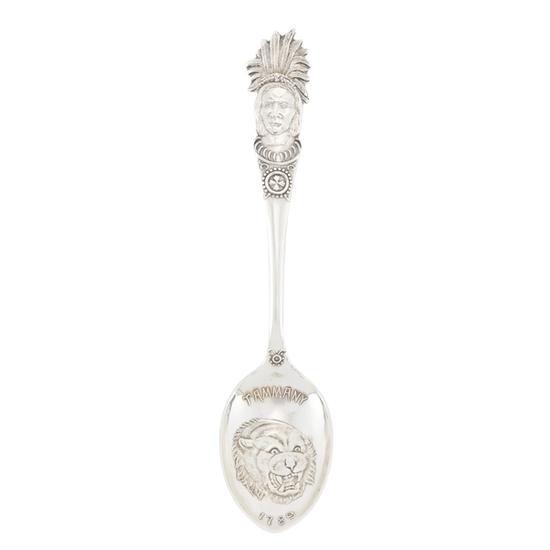 Souvenir spoon with image of lion inside bowl and handle end shaped with portrait bust of Native American. Inscription: Die-struck with raised lettering inside bowl: Tammany / 1789. Mark: On handle reverse: Alvin / [sword and crescent moon] / Mfg Co. / STERLING.