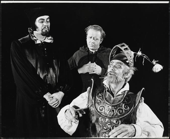 [David Atkinson as Don Quixote (Cervantes) and Patricia Marand as Aldonza in "Man of La Mancha".]