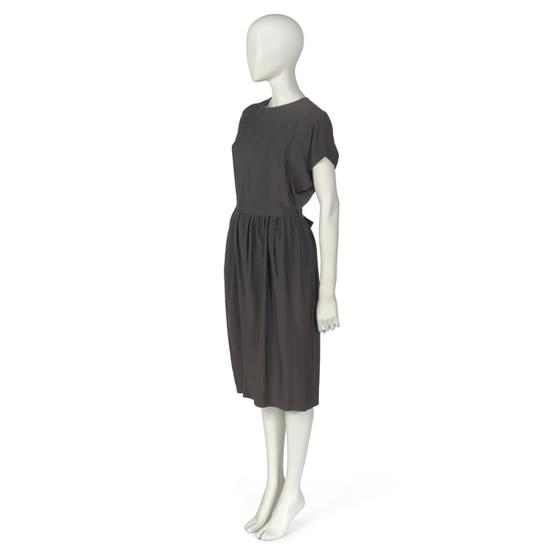 Day ensemble of white silk twill with abstract floral pattern executed in irregularly shaped navy dots