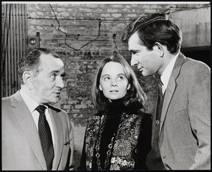 [Fritz Weaver as Sherlock Holmes, Martin Gabel as Professor Moriarty and Inga Swenson as Irene Adler in "Baker Street".]
