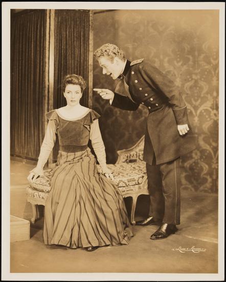 [Katherine Emery as Irina and John Boruff as Baron Tuzenbach in "The Three Sisters".]