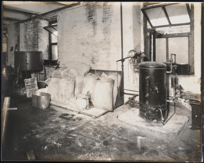 [Interior, manufacturing shop, metal melting furnace oven.]