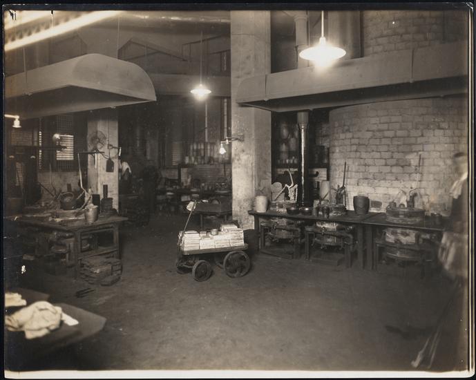 [Interior, manufacturing shop, metal melting oven.]