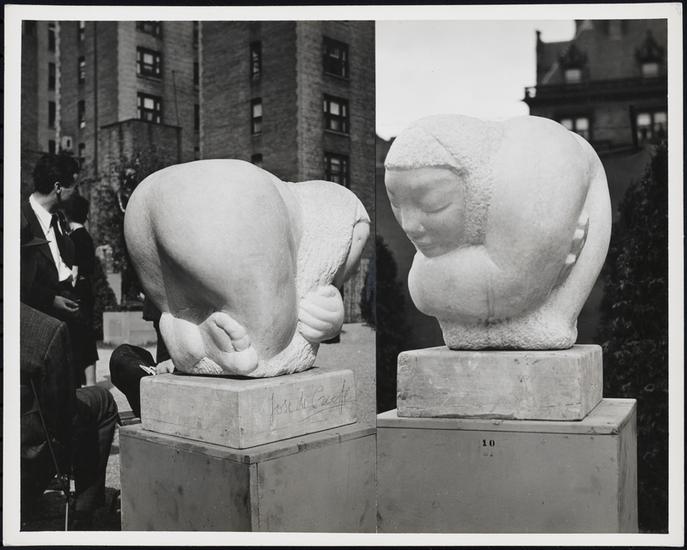 11 West 53rd Street. Museum of Modern Art. Rear sculpture garden. William Zorach at work on "Mother and Child" sculpture