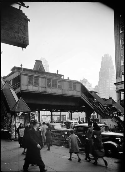 West 42nd Street and Sixth Avenue. Street view with stairs to elevated train and platform