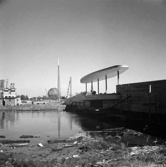 [New York World's Fair site under construction, with the steel frame of the Trylon in the background.]