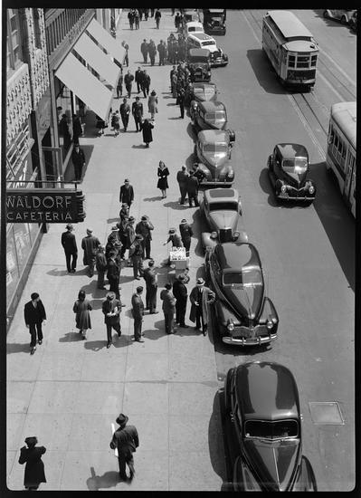 Woolworth Building Looking East [People walking past construction zone.]