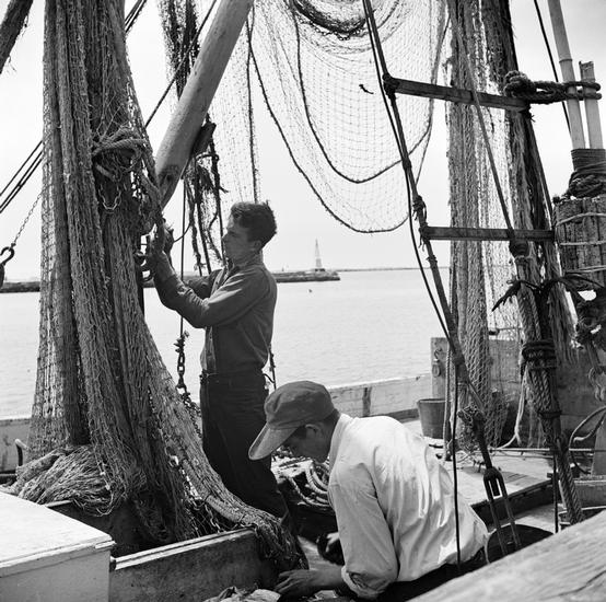 [Men hanging out on deck of ship with view of Manhattan skyline.]