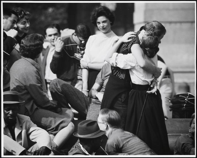 Girl in saddle shoes singing with guitarist, Washington Square Park
