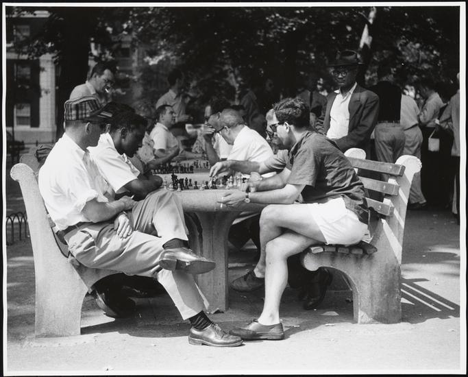 Man sleeping on fountain steps, three children in pool, Washington Square Park