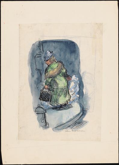 Don Freeman's Newsstand [Woman walking a dog as sanitation workers pick up garbage.]