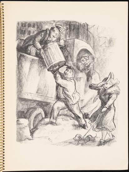 Don Freeman's Newsstand [Man and a child warming up by a fire in a garbage can.]
