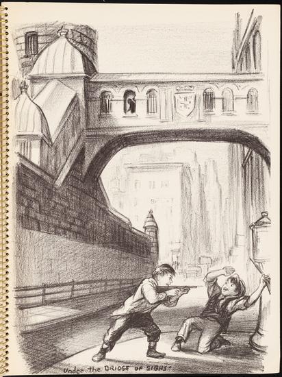 Don Freeman's Newsstand [Boys diving into the East River.]