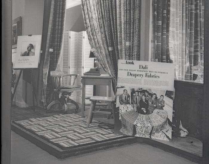 Salvador Dali: Rugs [Salvador Dali standing in front of a rug he designed near a table with objects.]