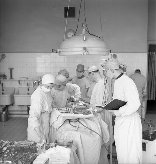 Photographs of doctor and medical illustrator Frank Netter performing surgery and drawing in an operating room, drawing in an office and a studio, laying on a couch with his wife at home, and sitting on a tractor with his children in front of his home. Date of assignment January 10, 1950. Negative frames: 10, Contact print frames: 29