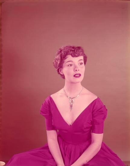 [Unidentified woman in white dress with pearl necklace and earrings, in profile]