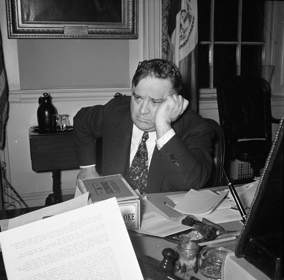 Laguardia, Mayor [Mayor La Guardia putting on his jacket in an office.]