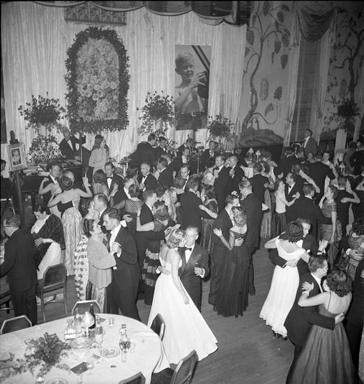 Beaux Arts Ball [Man, wearing makeup, drinking coffee at a costume party for members of the Architectural League of New York.]