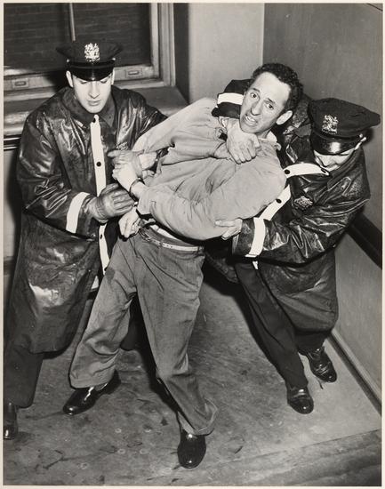 [Police tackle Barna Sarosky at Soviet UN delegation headquarters, during a protest against execution of Hungarian freedom fighters Imre Nagy and Pal Maleter.]
