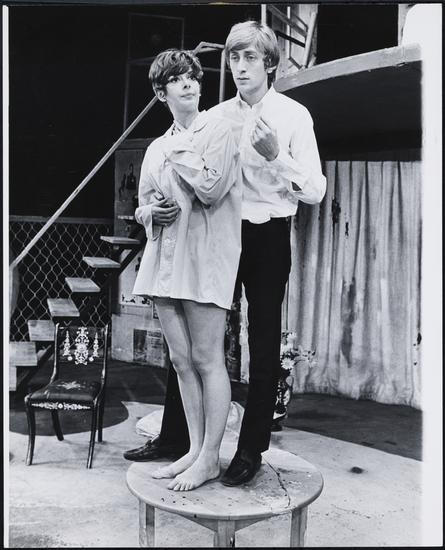 [Michael Crawford as Brindsley Miller and Geraldine Page as Clea in "Black Comedy".]