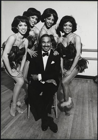 ["Cookie" Cook, Honi Coles and Bubba Gaines and the chorus girls during a rehearsal for "Black Broadway".]
