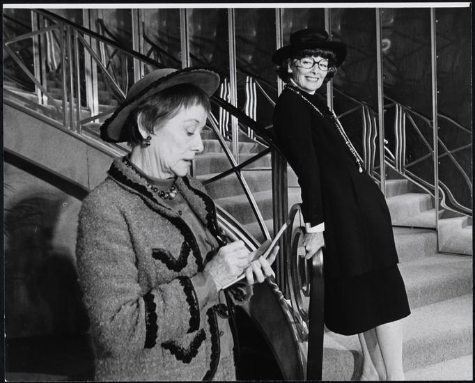 [Katharine Hepburn as Coco Chanel with ensemble in "Coco".]