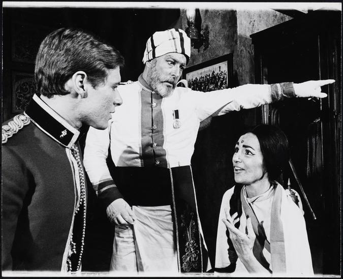 [Ronald Drake as Pradah Singh, Madhur Jaffrey as Mrs. Bandanai, and Paul Jones as 2nd Lt. Arthur Drake in "Conduct Unbecoming".]