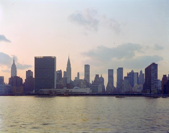 New York City Skyline at Dusk, East River, View From Pepsi-Cola Plant in Long Island City [Showing United Nations.]