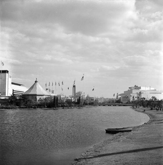 [View across Fountain Lake to the Parachute Jump, New York World's Fair.]