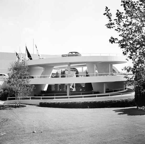 [Spiral driveway of the Ford building at the New York World's Fair.]