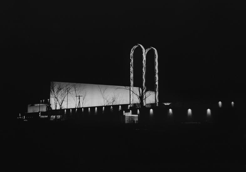 [Night view of the Kraft Foods (Sealtest) building under construction, New York World's Fair.]